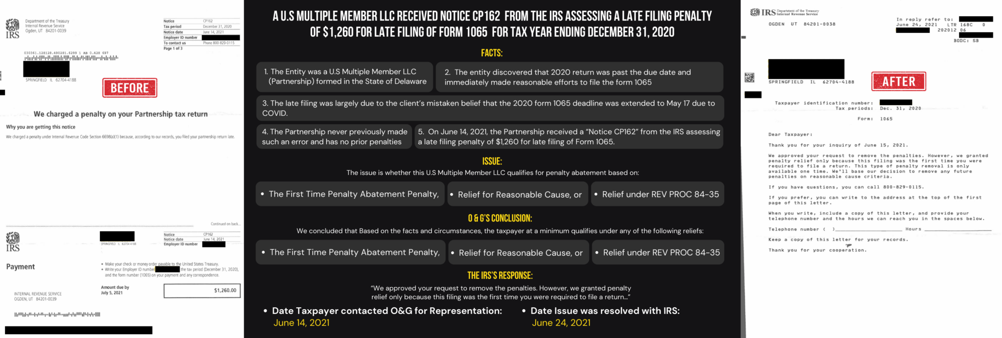A U.S Multiple Member LLC received Notice CP162 from the IRS assessing a late filing penalty of $1,260.00 for late filing of Form 1065 For Tax Year Ending December 31, 2020