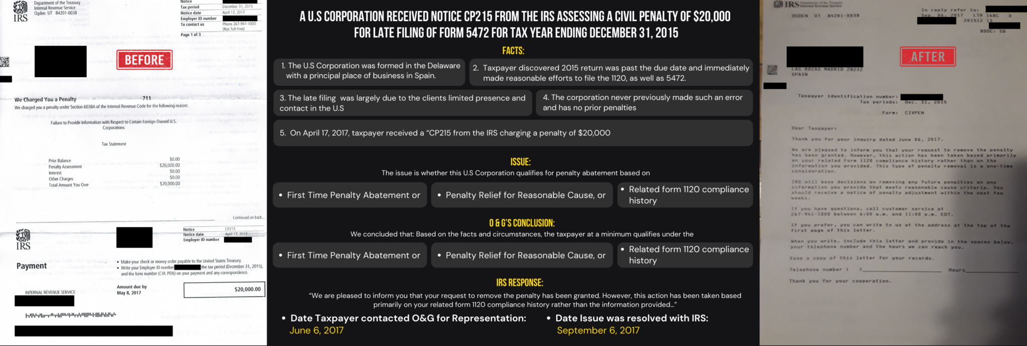 A U.S Corporation received Notice CP215 from the IRS assessing a civil penalty of $20,000 for late filing of Form 5472 For Tax Year Ending December 31, 2015